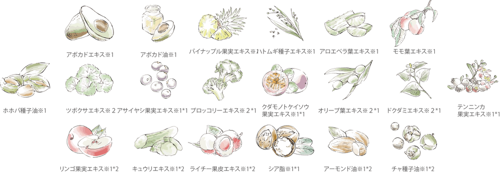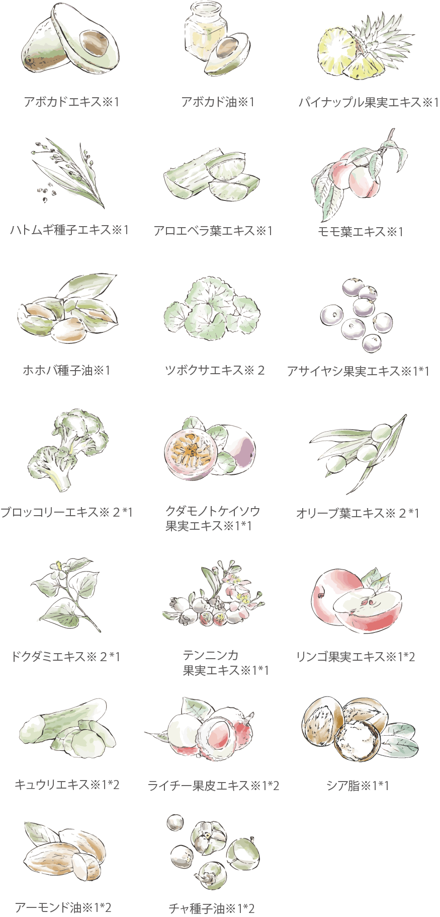 世界一栄養価の高い果物、アボカド。オレイン酸やレシチン、ビタミンEをはじめとする各種ビタミンが豊富に含まれています。この保湿力に優れたアボカドエキス・アボカドオイルをはじめ、自然由来植物オイル(シア脂・ホホバ種子油・チャ種子油など)を配合しました。
