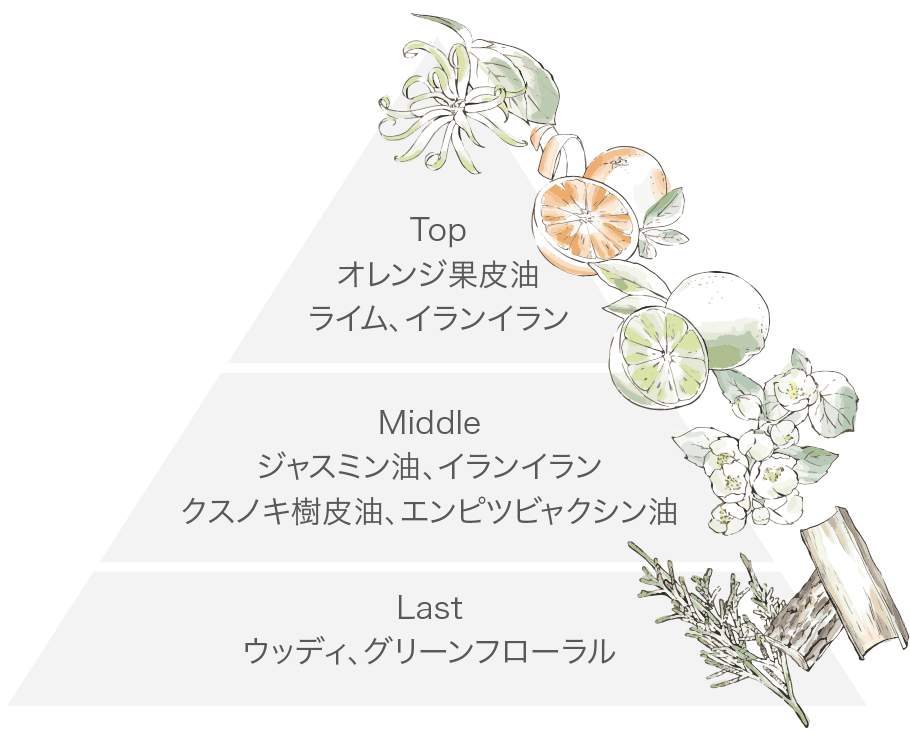 [香調] 爽やかなシトラスにイランイランのフローラルを加味したトップノート。