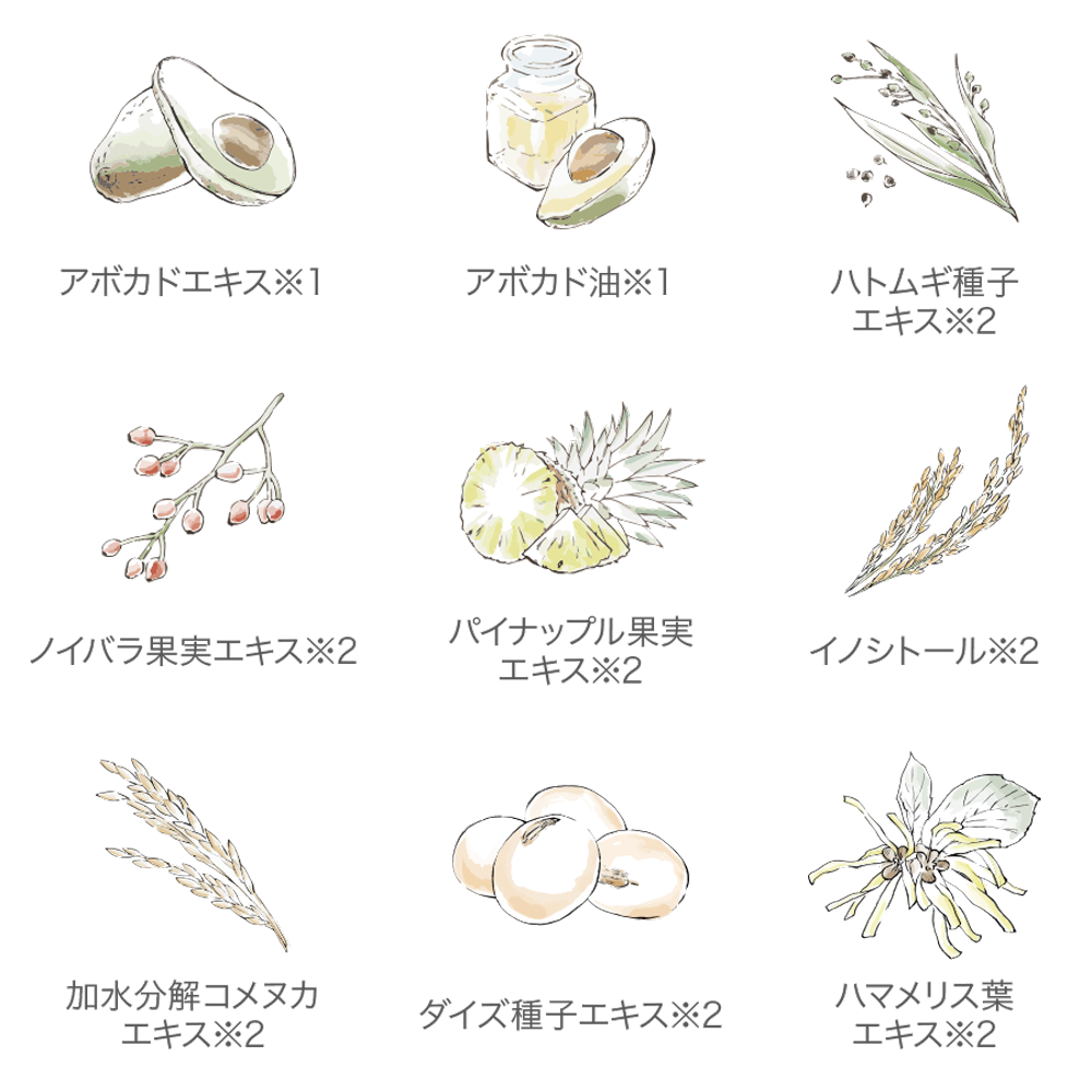 アボカドエキス※1やアボカドオイル※1・パイナップル果実エキス※1などの植物エキスと、もともと肌に存在する天然保湿成分のPCA-Naをプラスすることでメイクを丸ごと包み込んで、 肌の表面に水分と美容成分が一体になった繊細なヴェールでメイクをピタッと密着させます。