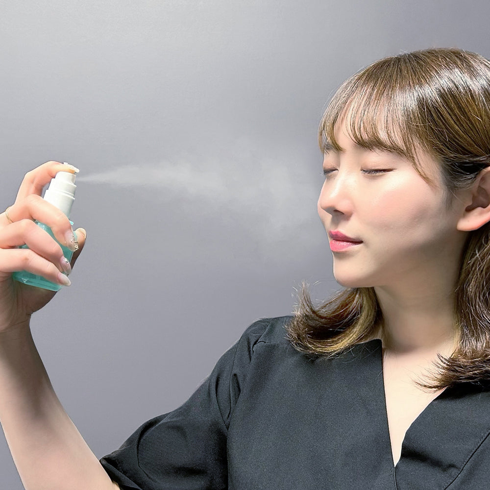 目・口を閉じて、顔全体にムラなくスプレーします。(6〜7プッシュが目安です。)